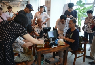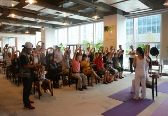记者中午时分到达活动地点,现场正有一群中年朋友跟随瑜伽老师听着音乐练习瑜伽,现场设置血压计等仪器,为参与者分别测量听音乐前后的血压以及血液微循环的情况,这样的活动颇有意思。