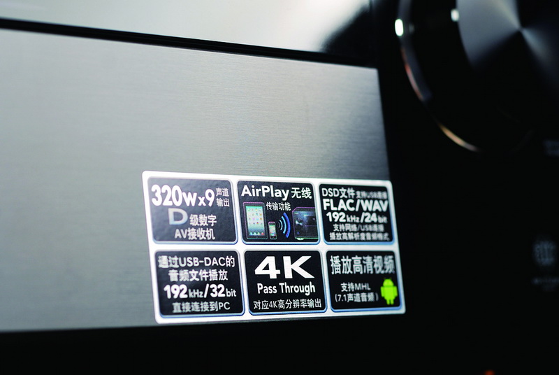 前面板的控制按钮一眼看上去感觉很复杂,可能一下子让人傻了眼,不过只要留意一下就能发现按钮都是按照菜单区、多房间音响控制区、听音模式选择区、广播收音区和苹果设备专区各就各位,十分有序的排列,操作起来也很顺手。值得一提的是最下方靠右处提供了前置iPhone/ iPad/iPod这个专用连接专区,前端最右下角也有提供一个前置HDMI输入接口,可以通过随机附送的MHL线缆快速连接兼容MHL的移动设备享受全高清视频、多声道音频和照片等,是很方便的设计。