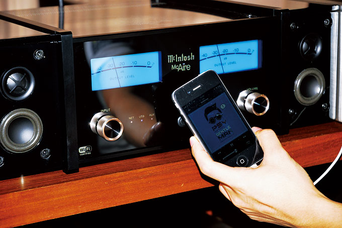 McAire可以通过Wi-Fi、USB(iPod)、RCA等方式接入,电脑或苹果手持设备通过无线连接到McAire之后,就可以在播放设备中找到McAire,选中后则可以使用McAire进行听音了。而USB接口则如其他dock类产品一样,用数据线连接苹果设备,然后在苹果设备上播放音乐,声音会从McAire中出来。值得一提的是,Mclntosh还特地准备了一个石质的底座,可以让数据线穿过底座然后将苹果设备放在上面,底座非常重,完全不用担心会倾倒,而且黑色外形也相当酷。从iPhone5之后苹果统一更换了手持设备所用的数据接口,所以让用户用自己的数据线来连接是个聪明的设计,这样新旧的设备都可以使用了。McIntosh同样也有针对智能手机推出的遥控应用程序,界面和McIntosh传统的蓝色面板一样,也很酷炫。