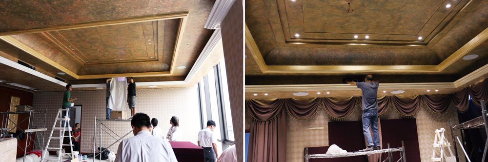前墙的安装柜体在现场拼装,同时要安装幕布和静电扬声器,走好各种相关的连接线。
