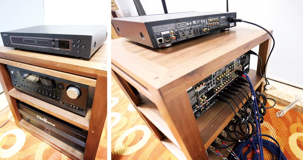 这个柜子是前期设计好,在加工厂加工完毕以后在现场拼装,而且一边拼装柜体,一边就要安装扬声器和投影幕,Martinlogan的扬声器都是要来插电源的,所以在柜体内还要走电源适配器和喇叭线,做到正常的连接。