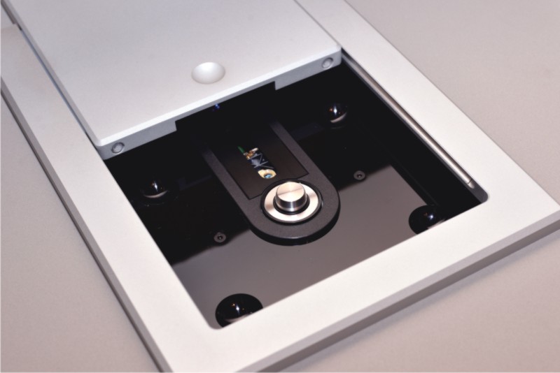 很多高端CD播放机都会使用的顶置滑盖碟仓,CD8SE也不例外,在试听时我特地感受了一下滑盖的推拉,发现滑盖推拉非常顺滑,手感不错。碟仓位于整个机体的正中央,中置的碟仓在读盘时,转盘转动的轴心靠近整个机体的中心,可以使播放机在读盘时的振动幅度减少,再配合三脚底座和整部机器的重量控制,将振动对光盘讯号读取的影响减至最少。