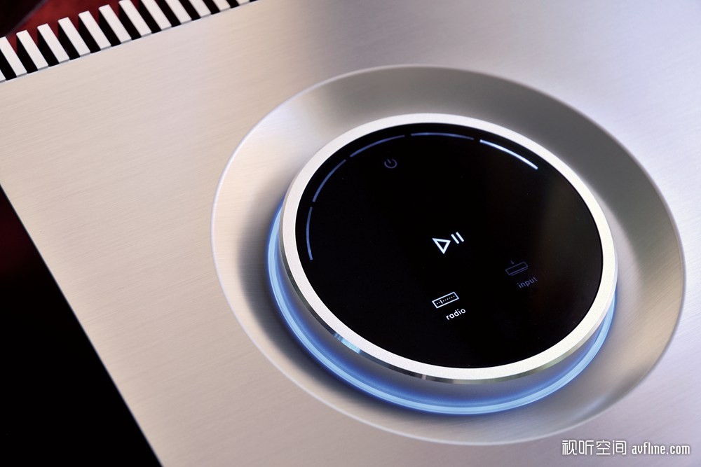 01、整机只有一个的控制旋钮,开机后会见到白色的灯光从镜面内发出,旋钮上只有简单的播放与暂停、Input以及与Radio的标识,即可通过触摸来控制机器。转动Mu-so的控制旋钮则可控制音量,而镜面外圈的白色灯条则显示当前音量的大小