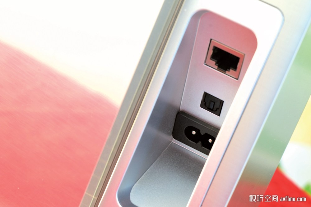 刚将Mu-so借回试音室的时候,各位编辑都对它“无从入手”,仅在右侧设置了1个3.5mm的输入接口以及1个A型USB,那么电源线呢?经过一番研究,笔者终于发现在右侧的底部装有电源接口、RJ45网线接口以及光纤接口各1个,此外还可通过Wi-Fi以及蓝牙连接,功能可谓十分之丰富。可能有朋友会问:“没有天线,Wi-Fi和蓝牙连接的信号会不会不好啊?”大家可以放心,Mu-so自带的隐藏式Wi-Fi接收天线是由Naim Audio的两组开发团队和伦敦大学教授共同研发的,Wi-Fi和蓝牙天线分别位于机背散热器和两枚低音单元之间,因此信号的接收是有保证的。