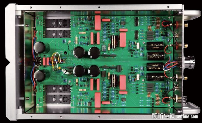 MCS II+唱放同样采用双单声道的设计,采用了Gruensch J-FET Current Amp 放大技术,单端纯A类设计,没有任何负反馈电路,这是Oliver与Eckhardt两父子设计的精髓所在。拆开MCS II+唱放的外壳,可以清楚看到整机采用的元器件都是十分顶级的,WIMA、M-CAP等电容井井有条地分布在电路板上。
