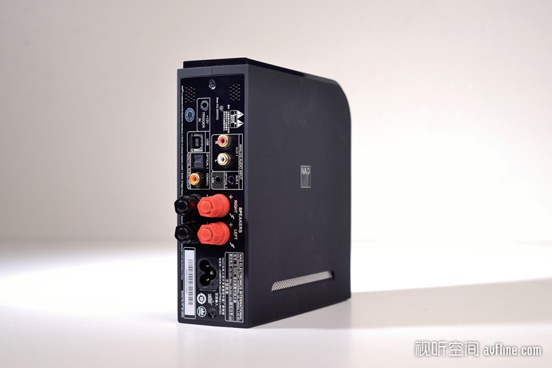NAD D3020的面世改写了功放的设计规则。以往的功放给人的印象都是沉实、笨重的感觉,D3020取而代之的是竖立摆放,仅仅一台光驱大小的外形,在本来位置就不多的桌面上使用,不会占太多的空间。而凸出来的是音量旋钮,假若将它平放的话,就像一台微型投影机。