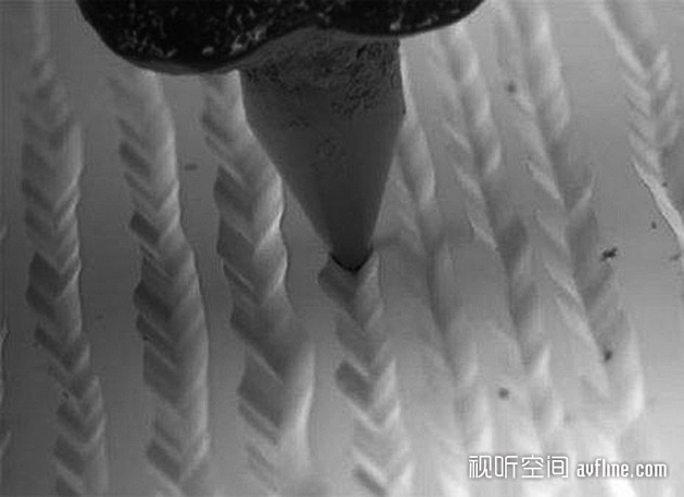 唱针不是尖的吗?难道还有不同形状?相信不少朋友和笔者一样充满疑惑。所谓“针”未必都是尖利的,Ken哥告诉我们,唱针的外形主要有圆针和椭圆针(另一说法为微线性针,线性针,椭圆形针,圆形针四大类),如果拿个放大镜来放大的话,我们可以看到唱针的尾部原来像圆珠笔尖的滚珠一样是圆的,这种就是圆针(Conical);另外一种是椭圆针(Elliptical),与圆针不同的是椭圆针的针尖两侧被切削掉,就像椭圆形一样,因此也显得更尖。