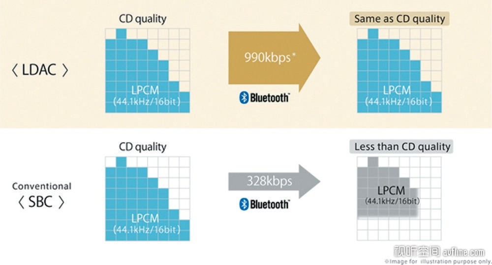 LDAC技术的应用带来的好处是:①3倍多的数据量使得所有音乐的聆听体验得到提升与增强;②与兼容蓝牙的其它编码(如,SBC)技术不同,其工作过程中不存在任何高分辨率音频内容(DSD格式的内容除外)的损失;③借助于有效编码和优化分组,能使高分辨率音频内容在蓝牙连接状态下平滑流畅传输。④拥有最大的比特深度和24bit/96kHz的优异频率特性;⑤高压缩效率和逼真还原;⑥无需先降频就能在压缩后直接传输到接收端进行解压缩,以确保不变的24bit/96kHz信号质量。