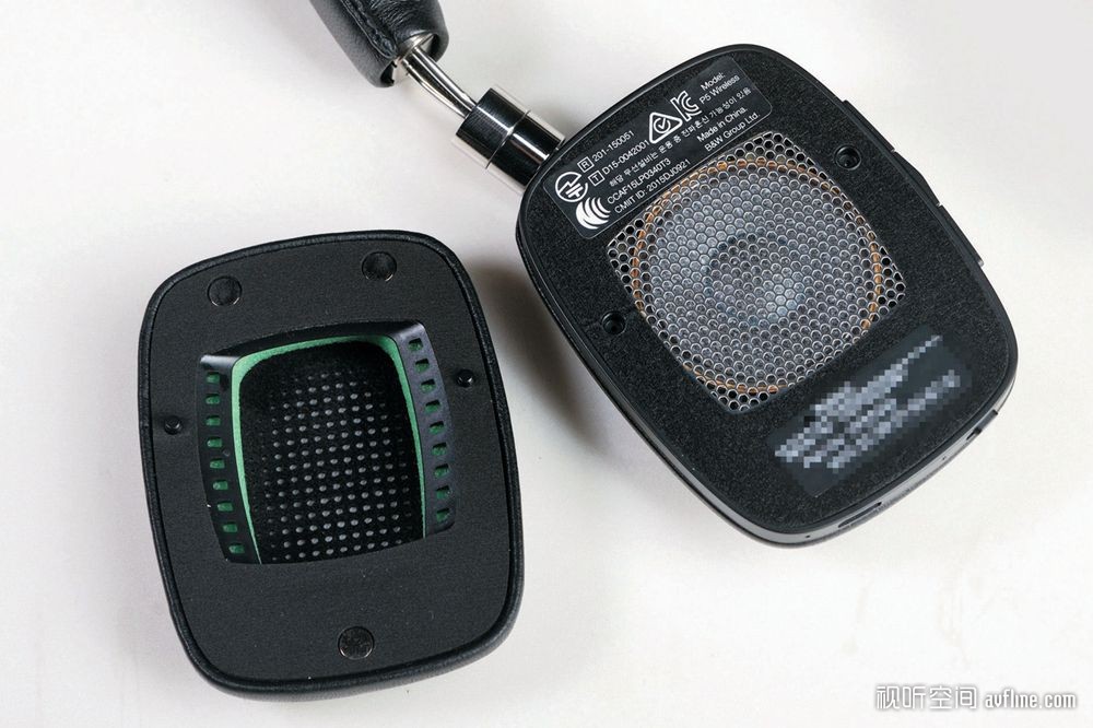 在此需要强调一下,我不是犯了强迫症非要组成“低调奢华有内涵”才起了这个小标题,而是真的有内涵!耳罩海绵部分,是由磁石进行吸合没有任何螺丝,稍微用力一掰,就可以掰开,但是也不用担心这个会不稳固,3块小磁石提供的吸力足够牢牢地吸住这么轻质的海绵。打开海绵我们可以看到金属网下面的1个1.5英寸全频喇叭单元,采用CCAW线圈(铜包铝线圈),阻抗22Ω。虽说是无线蓝牙耳机,但是还是支持模拟输入的,在左边耳机有接口,原包装也会配线。而蓝牙接收部分则在右边,控制音量和播放/暂停键,蓝牙功能键,除此之外,还有USB接口供充电用和2个小麦克风孔(均在右边)供通话用。耳机功能分布非常明确,左边模拟,右边蓝牙。