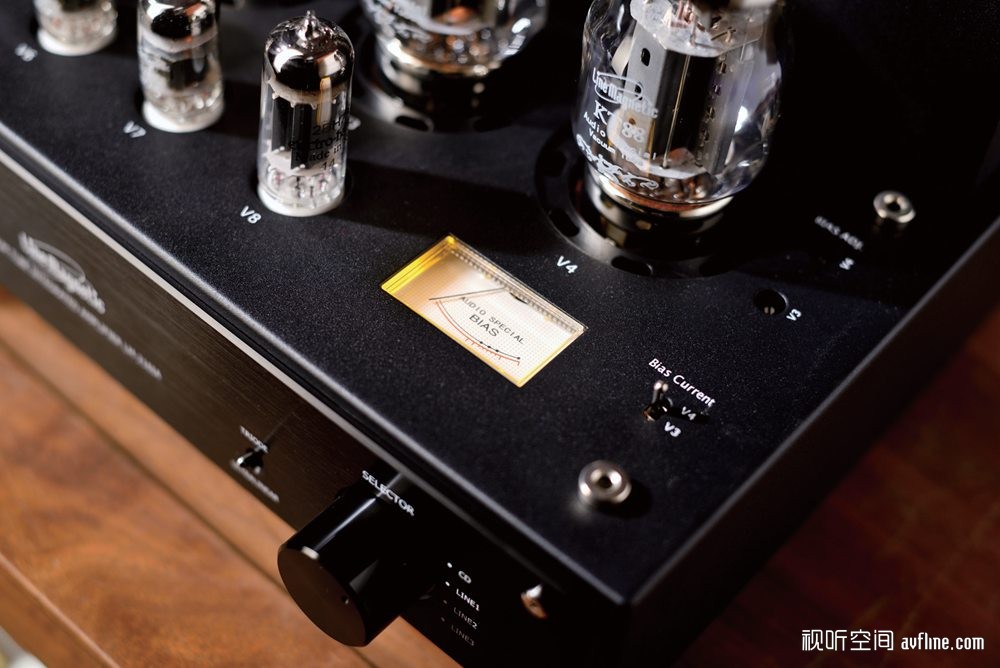 LM-216IA 面板上设有两种工作模式的切换开关,可以选择“TRIODE”三极和“ULTRALINEAR”超线性工作模式,在顶部面板还有外设功率管偏流调整钮和电流显示表头,为了保护电子管不受意外损坏,特设方便安装的拔插式真空管防护罩。另外本机还配备红外线遥控器,当然胆机普遍采用的开机静音延时功能也不会少。本刊的这台LM-216IA,KT88和12AX7胆管均打上丽磁的logo,显然是定制品,而12BH7却是俄罗斯的制品。