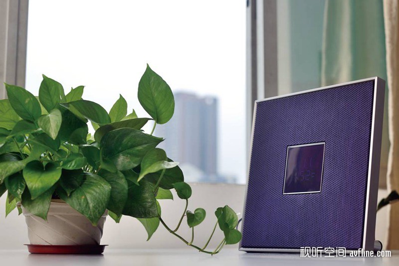 此次试听的ISX-80是紫色,共有黑白紫三种颜色供选择。正正方方的外形,最中间有一块正方形显示屏。面板由网编制而成,看起来好像是软的网面,实际摸上去却是硬的,是由金属拉制的。在这个金属网罩里面,藏着一对3cm高音单元和8cm低音单元,没错,就是在这个30cm×30cm的正方形面板内藏着一对“音箱”,这让我对它的音乐表现越来越期待。ISX-80内置放大器为15W(6Ω),对于一对3cm高音和8cm低音来说推力足够大了。