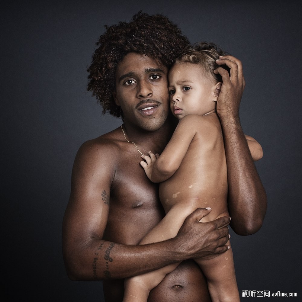 “我拍摄的是30岁到80岁的父亲们,半裸,站着,与下至几个月大上至年届五十的儿子们一起。他们距离很近,通常是皮肤贴着皮肤。看这些照片时,人们找寻着父与子的相似之处,对比着两人的轮廓、动作和神态。人们想象着其中的故事并尝试着穿透关系的秘密。赤裸的身体是一种困扰也是一种启示。”
