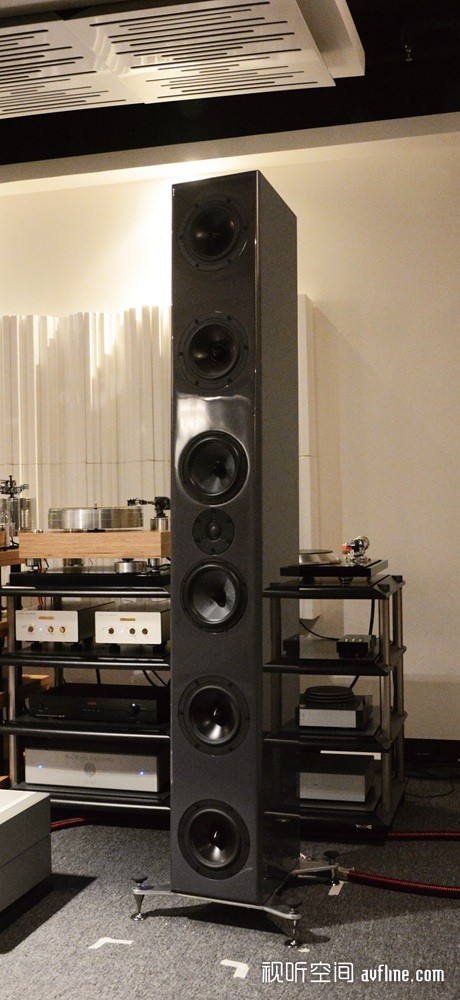 此外,映入眼帘的就是这次测评的主角——EAE E-5旗舰落地音箱,身材非常高挑的同时又非常修长,7个单元按照哑铃式的设计排列在前面板上。EAE的创办人兼设计师Leif Swanson先生对箱体的制作非常讲究,为了减低箱体内产生的驻波,E-3MKll的音箱与旗舰的E-5都设计成前宽后窄的梯型,这样的设计也能够防止音箱本身的震动而影响单元的表现。
