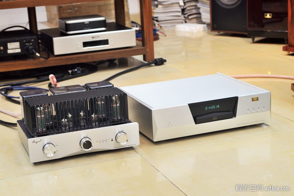 本次试听的主角是凯音CD-50T和A-50T组合,属于凯音入门级的产品,价格十分实惠,两台机子加起来只要1万元左右。CD-50T采用美国BB公司芯片PCM1792进行数字滤波,HDCD解码及D/A转换;模拟音频输出电路采用1只电子管12AU7做缓冲输出,型号中的“T”字也表明了它有使用电子管(tube)。CD-50T使用专门为本机研制的低漏磁、高效率环形电源变压器,电源供应也是很给力的。而A-50T采用纯胆、纯手工制作,整机采用搭棚焊接。A-50T使用专门为本机研制的环形电源变压器,输出采用2只优质宽频向EL变压器。前级使用了俄罗斯产12AX7EH和12AU7电子管各2只,后级则使用4只EL34电子管做AB1类推挽功率放大。A-50T有三极和超线性可选,三极声音更细腻,而超线性有更大的推力。