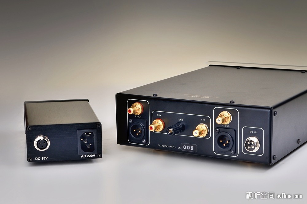 这是一台OEM国产唱放,产自广东省江门市,品牌叫“QUANLONG(权隆)”。QL AUDIO PRO II显然是第二代产品了,虽然售价数千元,定位却不低。QL AUDIO PRO II为分体式设计,电源与放大部分分离,以隔绝电源对放大电路的干扰,内部设置有1-10档的唱头阻抗、容抗和增益设置开关,方便用家根据唱头参数来调整设置,以符合唱头的输出要求。除了通常的RCA输出之外,QL AUDIO PRO II还具有XLR平衡输出,显得非常发烧。
