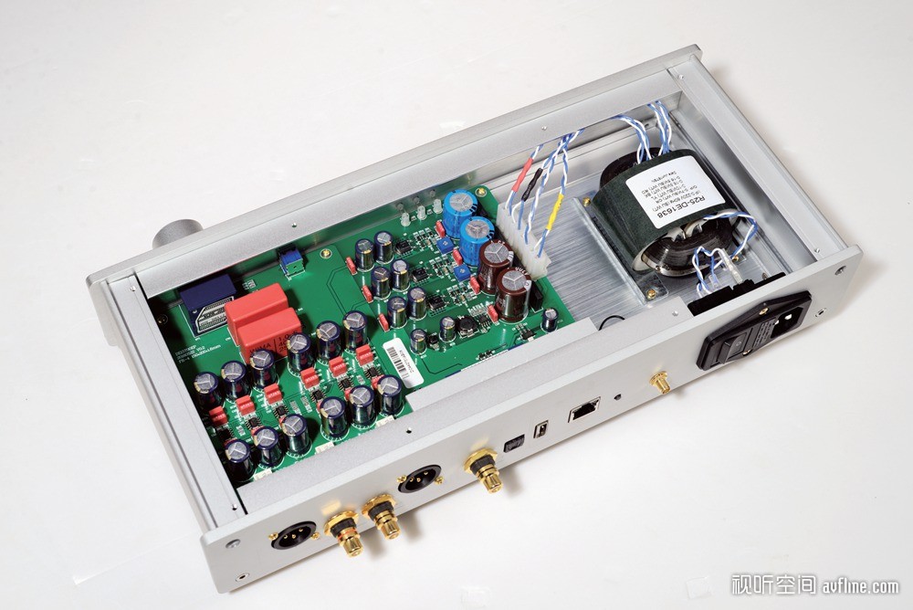 拆开顶盖,可以看到Venus 5的内部整齐美观,设计和用料也颇为讲究,是Venus 1无法相提并论的。电源对于器材的重要性就无需多说了,给整机供电的是一只R型变压器,这是一只高效低噪声、内阻小、低漏磁的变压器,而它的引线是特富龙的镀银线,除此之外电源插座用上瑞士舒特尔的产品,搭配低阻的美国Bel保险管,保证电流的传输。在Venus 5的主板上还可以看到飞利浦BC电容、松下FC发烧级电容以及德国WIMA威马电容的身影,这些电容都是性能一流的发烧元件,能确保电源的滤波与信号的传输效果。