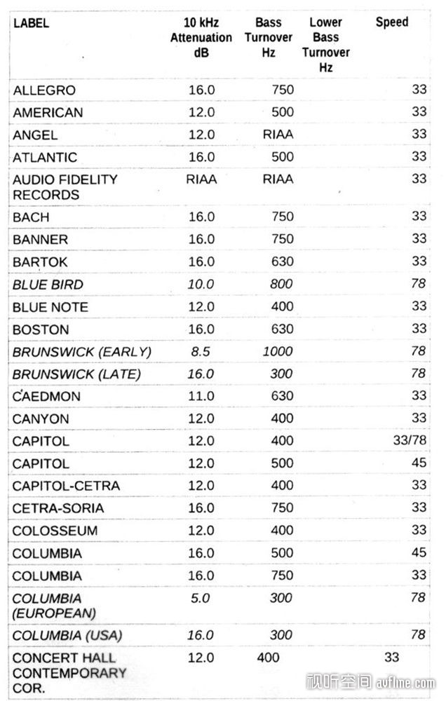 某唱放说明书上提供了不同唱片厂牌不同年代的还原曲线调整表(部分)