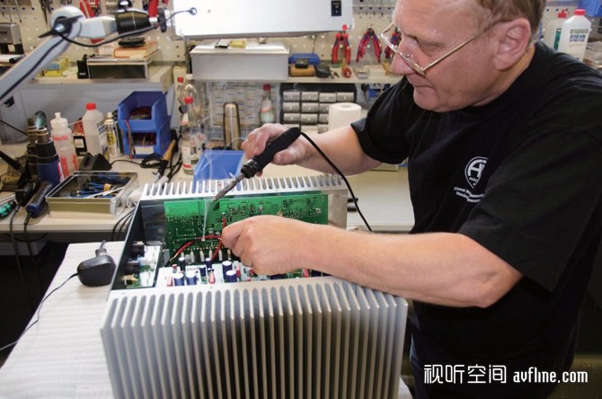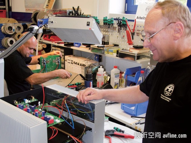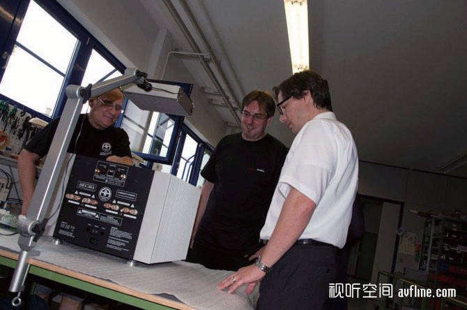 一位技师示范如何装配Amp II后级,线路板连接好后,测试仪器开始进行包括直流偏移、保护线路、晶体管配对、噪音、接地等检测,一有异常马上发出警讯。整部Amp II必须通过多达50项的测试项目,之后通电热机100小时,包装前还要进行一次测试。在与Martin交谈的过程中,他并没有提出很稀奇的线路或创意,品质却是不断强调的重点。并不是Accustic Arts固步自封,Martin认为电子方面的技术对消费者并不重要,那是设计师的责任。正如奔驰汽车的主人不需要明白自动波是如何工作的,这部车却能提供驾驭者舒适、安全、快意的操控感。同样的,发烧友只要放心享受很有人情味的声音效果,复杂的设定程序与耐用性就交给Accustic Arts。