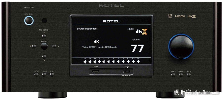 RAP-1580作为最新最尖端的AV处理器,对音频视频的支持当然也是相当全面的。除了支持最新的HDMI 2.0a硬件、DTS:X、Dolby TrueHD和Dolby Atmos 7.1.4解码,这些被认为现在AV功放标配的功能外,还支持PC-USB输入,播放器除了蓝光机,还能选用手机或电脑端,甚至苹果MacBook都能与之进行连接,更贴近普罗大众的播放习惯。内置蓝牙,支持24bit/192kHz的LPCM音频格式,而且集成了唱放模块,完全符合了Rotel“一机足矣”的定位。