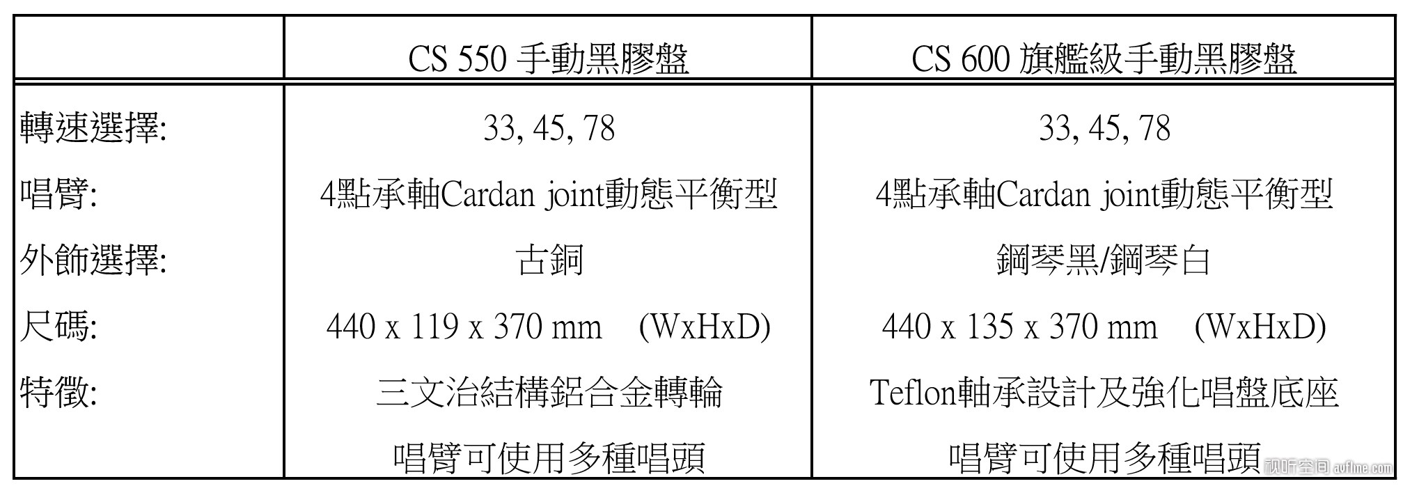 除自动唱盘外,德国Dual亦有推出全手动式黑胶盘,分别为CS 550和旗舰级CS 600。两款唱盘均采用厂方特别设计的4点承轴的Cardan joint式动态平衡型唱臂,设有VTA、反偏压等多种调校功能和可选购重型砣,令唱盘能使用不同类别及重量的高级唱头。转盘采用高密度三文治式结构铝合金制成,有效减低谐震;内置的精密DC马达和带动结构,加上电子控速,巧妙的配合内藏Teflon(铁弗龙)的轴承设计,带来更稳定的转速和更宁静的背景音乐效果,无论是33, 45或78rpm转速下都能将唱片的讯号续一还原,绝对能符合高级唱盘的表现要求。CS 600唱盘外型吸引,备有钢琴黑和白两款选择,而CS550的古铜褐色,令唱盘增添多份现代感!