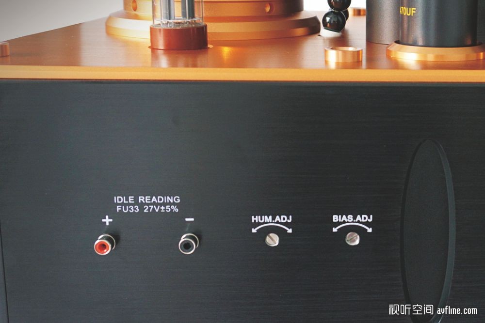 另外在MC833-A侧面还有一组偏压检测端子,可以配合电压表和旁边的“BIAS.ADJ”来进行偏压调节,在“BIAS.ADJ”左侧的“HUM.ADJ”则可以进行哼声调节。在机器使用一段时间,或者更换电子管之后,有必要对偏压进行检测,以保持最佳的工作状态。