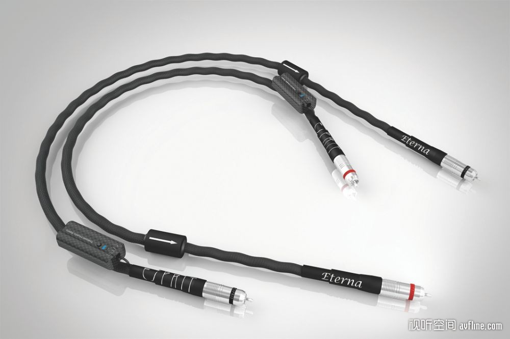 Eterna永恒系列RCA信号线:40μm镀银纯铜接头,含电池供电极化处理,810 股纯铜内芯,特殊内芯绞合技术多层分段屏蔽,三重结构空气/玻璃纤维绝缘/屏蔽层。