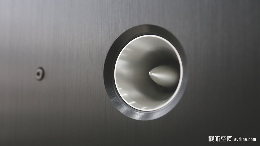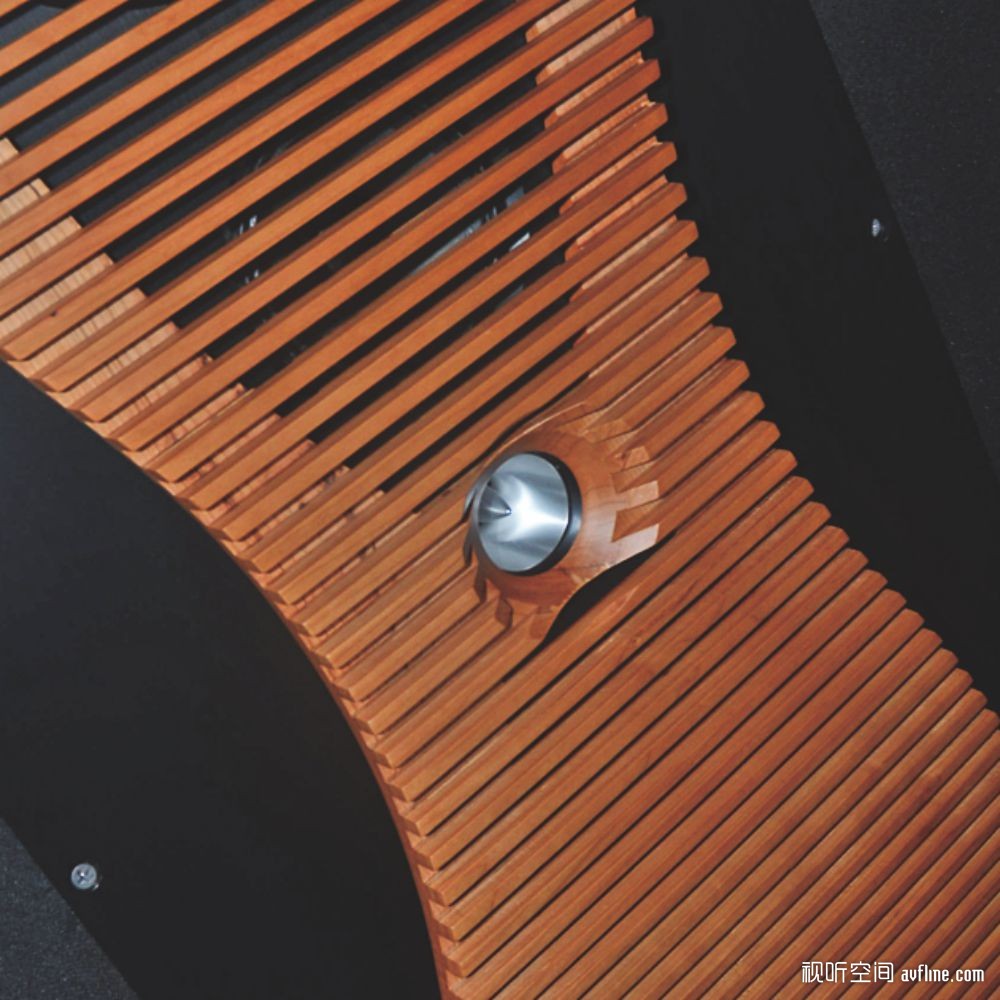 仔细观察这个高音单元,在非常漂亮的圆柱形金属外壳里,装载着通过特殊处理的振膜,然后中间看到一个类似子弹一般造型的结构。单元的原理简单来说就是以一片非常薄的聚脂薄膜作为振膜,把周边边缘固定,振膜后面就是磁铁,音圈是印刷在振膜上的,位于磁场中的音圈在接到放大器输送的音频电流时便带动振膜发声。它的原理有点像磁力平板音响,所以这枚高音的下半部分厚度并不厚,发声体是被固定在高3公分、直径6公分的圆柱形腔体里的。为了让喷射出的高音更加聚集能量,并形成类似于像冲击波一样的效果,在高音的前半部分是一个类似于子弹头一样的腔体,在这个特别的造型下,可以提升高音的穿透力,让高音在有更好的灵敏度同时不被一般的透声布和幕布消耗掉高音的能量。