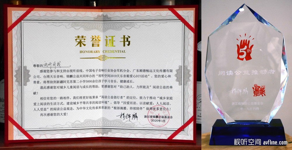 2020年1月11日下午,视听空间2019天乐音箱爱心DIY活动捐赠和颁发证书仪式在顺德畅远文化的试音室中顺利进行。浙江省锦麟公益基金会卜飞秘书长、中国电子音响行业协会彭泓副秘书长、广东顺德畅远文化传播有限公司总经理陈允海先生、雨果唱片创始人易有伍先生、《视听前线》杂志主编张戈先生、视听空间论坛版主陈怀冰先生等嘉宾亲临现场,为10对音箱的制作者和认购者颁发荣誉证书,并举行了捐赠仪式。