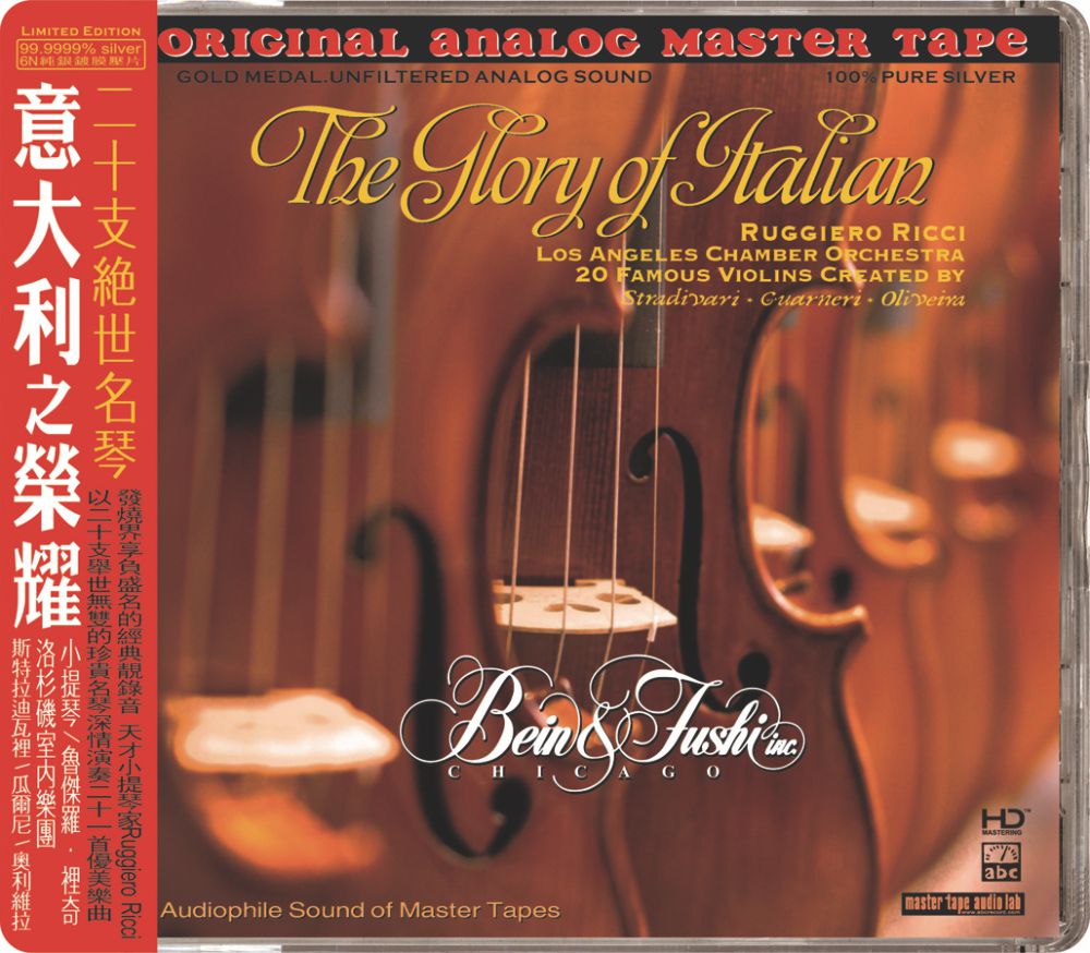 《意大利之荣耀》,是已故小提琴大师的鲁杰罗•里奇(Ruggiero Ricc)的录音精粹。被誉为“天生的演奏家”的里奇,是第一个录制帕格尼尼24首小提琴随想曲的小提琴家,对发掘推广小提琴音乐史上的冷门作品也贡献良多。《意大利之荣耀》收入了鲁杰罗•里奇的21首珍贵古典音乐小品录音,包括萨拉萨蒂的《流浪者之歌》和《木屐舞曲》,柴可夫斯基的《旋律》等脍炙人口的动听曲目。最让人惊喜的是,鲁杰罗•里奇共计使用了20把价值连城的古董小提琴,10把斯特拉迪瓦里(Stradivari),和10把瓜奈里(Guarneri Del Gesù),使得此碟成为“最昂贵”的古董名琴录音。在里奇这张录音中我们可以得见他堪称完美的演奏技术,采用小编制室内乐伴奏,录音师对麦克风摆位精心设计,营造出了非常有临场感的演出效果。