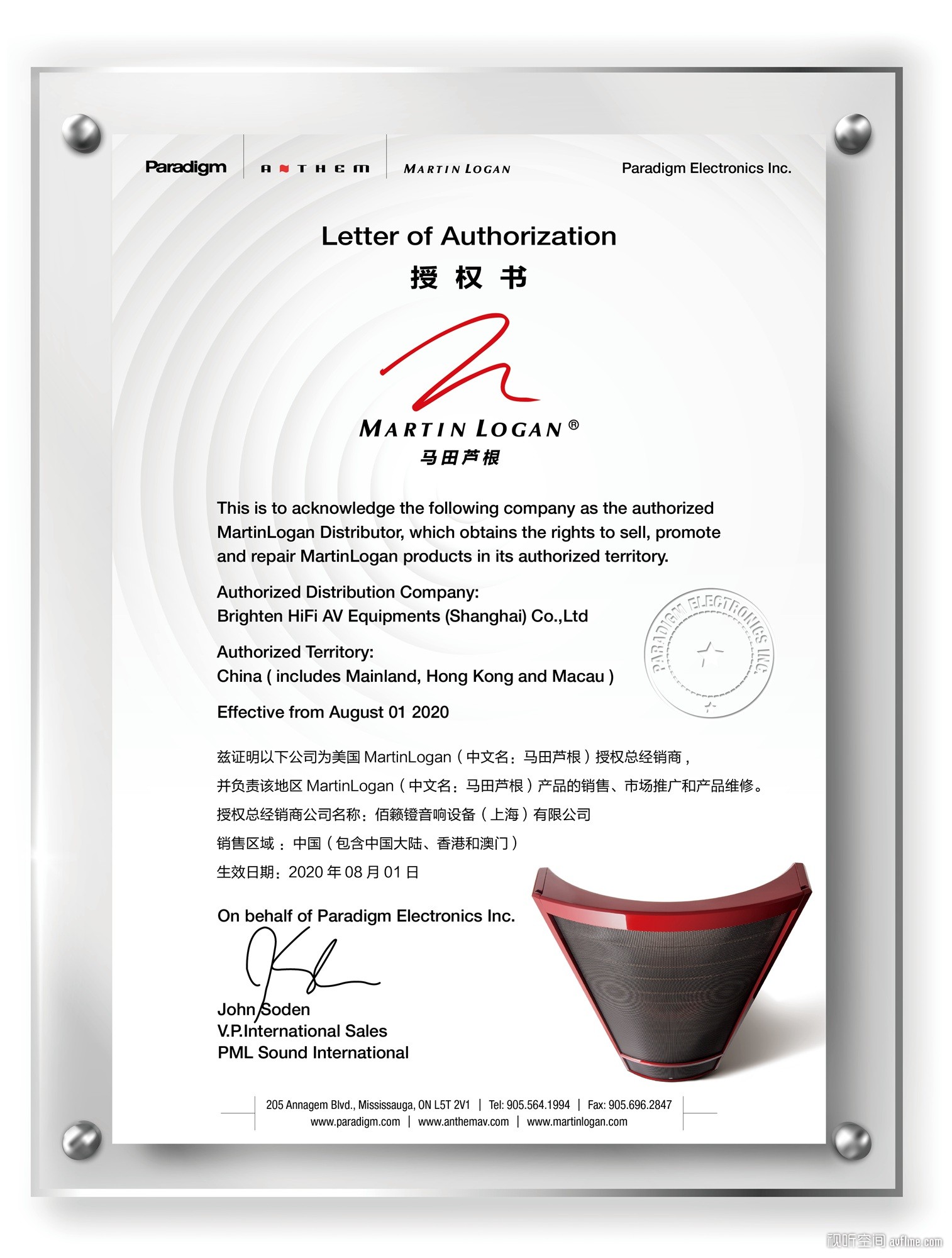 加拿大Paradigm百里登集团旗下三大品牌:Paradigm(百里登)、MartinLogan(马田芦根)、Anthem(圣歌)正式授权委任:佰籁镫音响设备(上海)有限公司为中国地区(包括港、澳)独家总代理,2020年8月1日起全面推进双方长期深度合作。