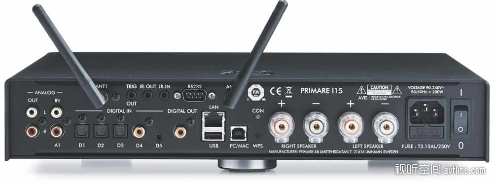 相对420mm宽度的标准机身而言,Prisma这一系列都采用了350mm宽度的窄机身设计,以维持其小巧玲珑的体型。虽然I15 Prisma机身只有标准尺寸的四分之三,但是功能齐全且性能强大。除了串流功能之外,更设有3组光纤、1组同轴、1组电脑USB以及1组RCA输出,方便连接各种前端设备。