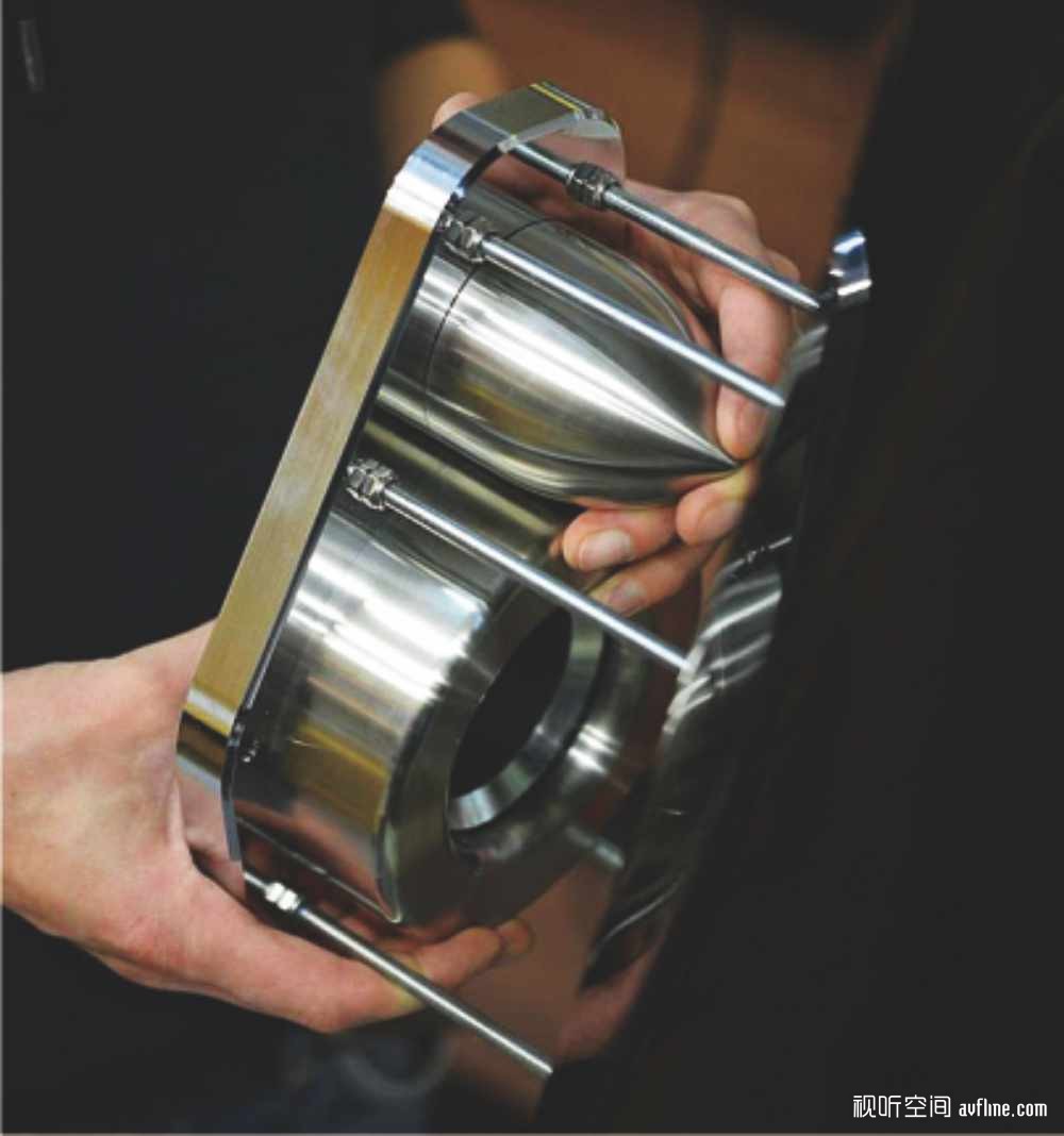 为了最大程度提升其对空气的驱动能力,这枚钻石中音的活塞冲程更是达到惊人的7mm。由于钻石材质的导热性能极佳,所以也确保了在如此激烈的运作过程中,音圈所产生的巨大热量会被迅速发散。此外,钻石中音单元的外框以实心铝合金CNC工艺车制,达到最大的框体刚性,确保单元工作在最佳的环境当中。