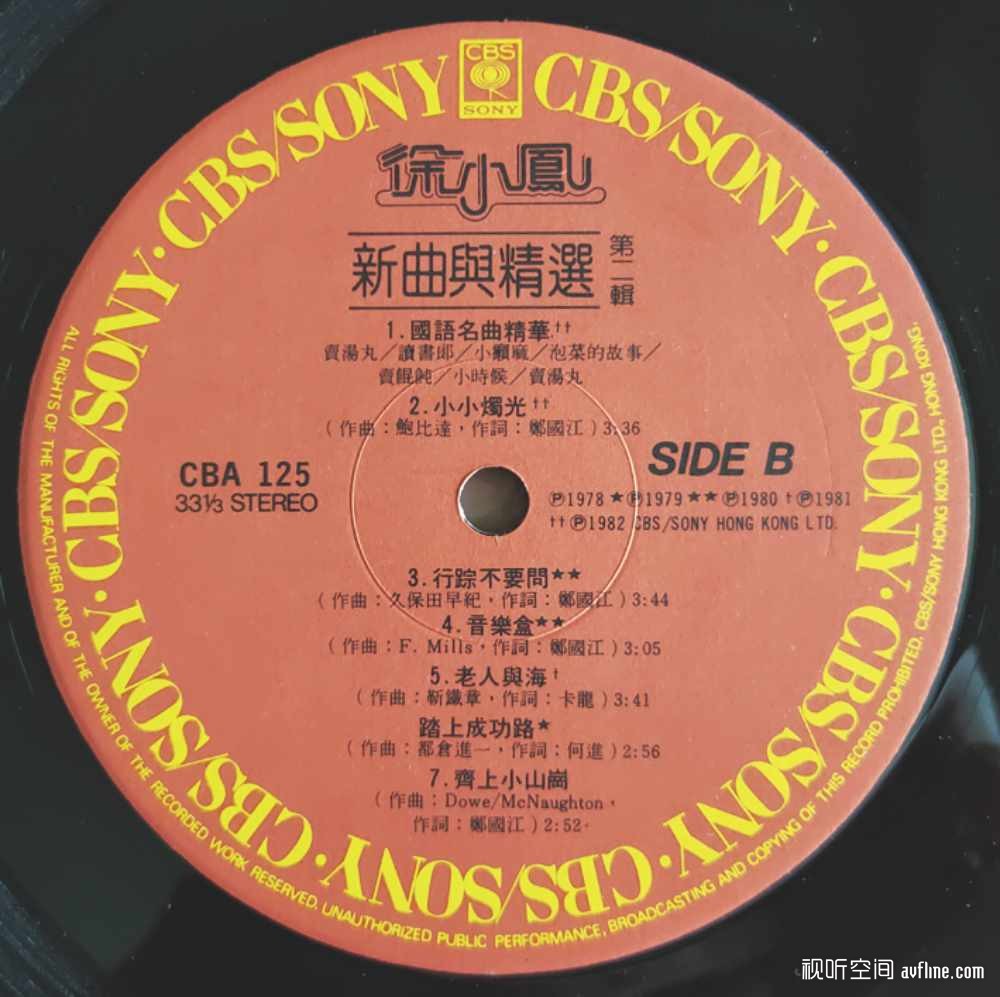 就听感而言,无独有偶,香港流行歌曲黑胶唱片无论何唱片公司、何歌星的黑胶唱片,几乎均存在圈心边缘的平凸版本或版次问题,且在同一版本、同一系统音响系统情况下,几乎所有的全平圈心版次均比全凸圈心版次和平凸圈心版次,声音还原背景更为宁静、层次感更为分明、声音密度更高、更厚润、嘴形更细、更经久耐听等,只不过有的差别明显度不同而已。徐小凤《新曲与精选》第一辑与第二辑也不例外,全平圈心版比全凸圈心版较为厚润、宁静、耐听。当然,这是相对而言,如果横向与专辑对比,这两张精选与专辑的单首歌对比,专辑的厚润度仍然稍胜,这通常是精选的不足,但精选歌曲的优势又是专辑无法比拟的,这又是精选歌曲的优势。