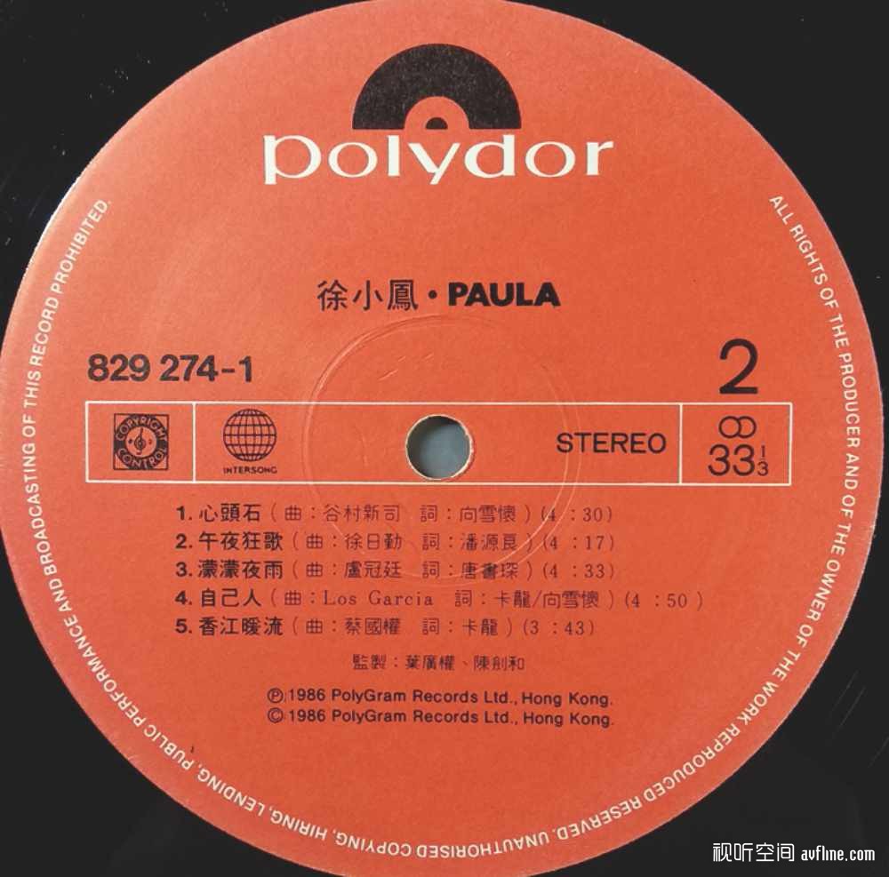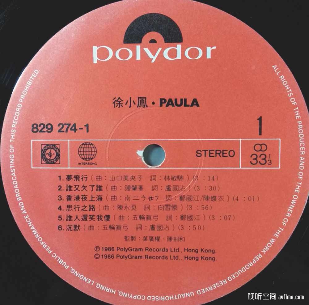 同一年,宝丽金马不停蹄为徐小凤推出第二张专辑《Paula》,在音响发烧界又称之为《梦飞行》。香港《MusicBus》杂志1986年11月记载,《梦飞行》是“一首改自日本歌曲而富中国小调味道的歌曲,加了扬琴令效果有些不同。林敏聪的古怪鬼马歌词,令徐小凤觉得十分新鲜。因歌词太密,要一粒粒去唱,演绎时也觉颇难,但具挑战性。本来徐小凤有意用此曲作为Title Song,但与唱片封面设计不配合,于是决定弃用Title song”。(一)《Paula》的封套设计成就了徐小凤的一个经典,徐小凤穿着波点裙,手扶麦克风,一副上海滩舞台演出的感觉,也回应了歌曲《香港夜上海》的意念,波点裙可能太适合徐小凤了,徐小凤为推广该专辑还穿着波点裙拍摄了一辑MV,给市场留下了深刻的印象,此后每当重要时刻,徐小凤常以波点裙示人。(二)《Paula》随唱片赠送一张大海报,同样是封套盛装波点裙手扶麦克风开口唱歌状态,动感十足,画质优良,徐小凤的黑胶唱片本来就不多赠送海报,这张大海报可能是徐小凤所有唱片中尺寸最大、质量最好、形象最甜美的一张,因而部分音响及音乐发烧友常将其镶入画框挂于墙上,因时代气息浓厚而备受追棒,市场价已达300元之高,且还不多见。(三)专辑共11首歌,包括《梦飞行》《谁又欠了谁》《香港夜上海》《思行之路》《谁人还笑我傻》《沉默》《心头石》《午夜狂歌》《蒙蒙夜雨》《自己人》《香江暖流》,只要看看词曲作者,不难看出,均出自一线名家之手,其中卢国沾作词、钟肇峰作曲的《谁又欠了谁》一直是笔者最爱之一,歌中独白深谙哲理,据说前两句为向雪怀所写,而“生活系呢个半真半假既世界里面,究竟边一个欠边一个呢”则为徐小凤有感而发所写的。其实,写就此文时,笔者再次从头到尾听罢此碟,歌曲大多以慢歌为主,十分抒情,适合个人独处或夜晚聆听。但可能唱片发行频繁,又可能当时香港流行乐坛百花齐放,市场目不暇给,上述两张专辑歌曲的社会传唱度,其实在徐小凤的唱片中并不算高,但全碟歌曲的可听性却颇高。社会传唱度不高的歌曲,由于种种原因,部分并不是因为可听性不高所致,这就给了我们用心发掘的机会,对于海量级的香港流行歌曲,这是音响发烧友仍有兴趣去探究、海淘、捡漏的重要原因。无论如何挑剔,总有那么几首歌曲能唱到你心坎里去。
