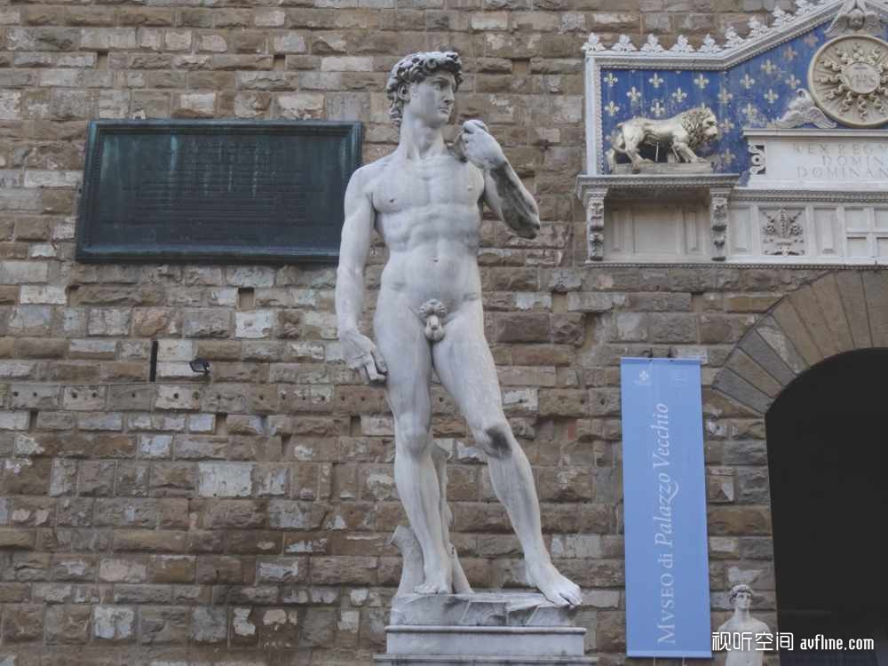 来佛罗伦萨,首要的事情,欣赏米开朗琪罗《大卫》。导游说:“这里有三座《大卫》雕像,两白一黑,一真二假。其实,雕塑不是绘画,只要复制得精确严谨,看复制品和看原作效果几乎完全一样。当然,看真品,还有个心理暗示作用在影响你,帮助你,激励着你的欣赏。这点自然要另当别论啦。”跟着导游来到米开朗琪罗广场,此地是佛罗伦萨唯一天然制高点,山虽不高,真可以“一览翡城小”!遥岑远目,眼前苍然秀色,晴川历历,一下子,心胸就开阔了。目尽青天,可以清晰地望见阿诺河波光粼粼,在山脚下缓缓流淌,望见圣母百花大教堂和维奇奥宫的屋顶色泽斑斓,在阳光下熠熠闪烁。这里的《大卫》是一尊青铜雕塑,矗立广场中央。到它跟前仔细端详:哈,原来它并不是黑色的,而是一种深绿和铜棕混合在一起的古青铜颜色,深沉厚重,古意斐然,迥异于国人通常印象中之《大卫》,大理石材质通体洁白。你看他身躯健美挺拔,周身肌肉线条清晰,一派青春健康的气质洋溢而出,这一切应该和原作毫无二致。在《大卫》青铜雕塑的四周,是米开朗琪罗创作的、后来根据原作按一定比例缩小的《昼》、《夜》、《晨》、《暮》四座不朽雕塑的青铜复制品。