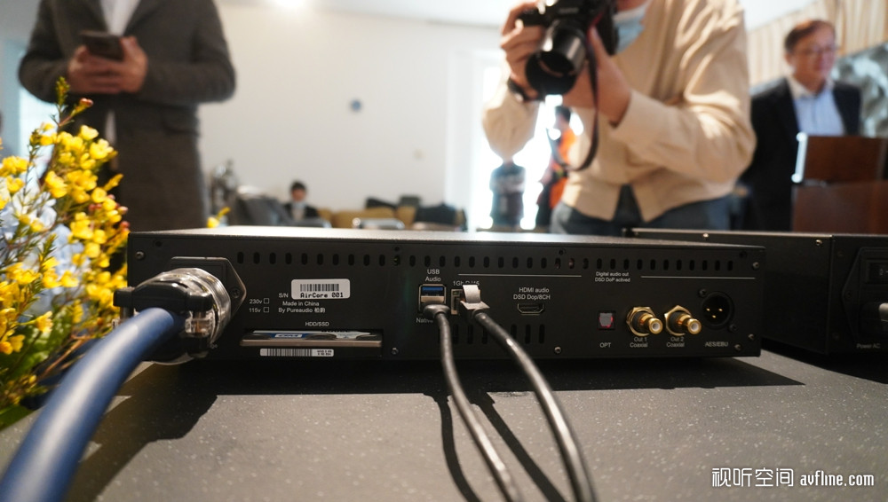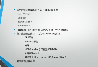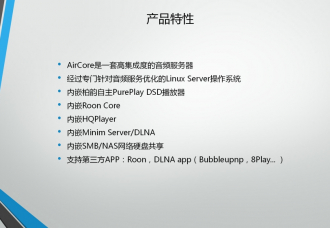 AirCore是一套高集成度的音频服务器,采用的低功耗NUC嵌入式一体化X86主板、第七代i7处理器,运行经过专门针对音频服务优化的Linux Server操作系统,让其有着出色的处理能力。内置5TB的2.5寸磁盘,用户也可通过内置的2.5寸硬盘座扩展硬盘。输出方面提供了AES/EBU、同轴、光纤、HDMI audio(可输出8CH DSD)、USB audio,其中USB和HDMI支持DSD源码输出,其他接口支持DSD Dop协议,方便用家接驳各解码。