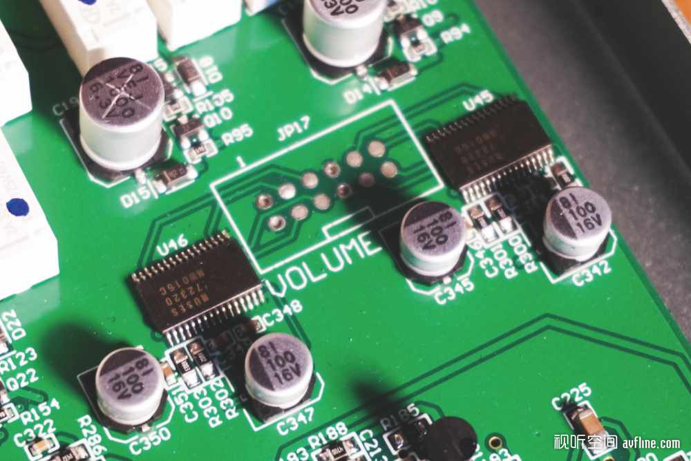 打开DDP-2的外盖,里面的线路排列非常整齐。DDP-2除了使用开关电源供电之外,更采用了线性电源为模拟电路部分供电,这也是Alchemy的产品比同类型的产品声音要好的原因之一。数码和模拟电路分为两块电路板,我们先来看看数码部分,采用了AKM的AK4115VQ接收芯片,系统部分采用了Analog Devices的处理器,解码则采用了两片AKM的AK4493EQ,为全平衡解码电路。模拟部分采用了一对Muses72320的音量芯片,从解码到音量再到输出均为全平衡设计。耳放采用了独立的BB OPA4134UA芯片进行驱动。值得一提的是,DDP-2的模拟输入只是经过了内部的音量控制芯片,并没有像一些多功能一体机那样先AD再DA,确保了声音的原汁原味。