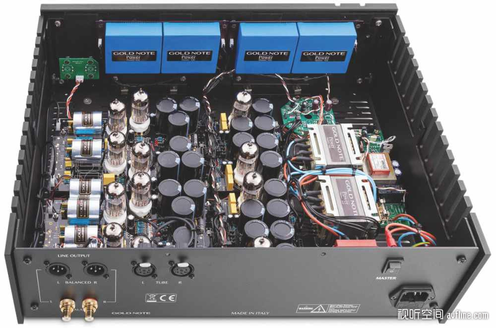 而对于TUBE-1006胆处理器,其内部结构咋看是左、右声道独立供电的全“对称”排列,可见有两个变压器和两份“相同”的线路板。但细看又发觉不对劲,因为那两份看似一模一样的线路板其实是有区别的:一块线路板上有4只6N1P电子管,另一块线路板上却只有2只6N1P;一块线路板上有4只打上GOLD NOTE标记的蓝色输出电容,另一块线路板上只有2只。后来一想才恍然大悟:原来GOLD NOTE走的是平衡放大、非平衡放大各自独立的路线,两种放大方式各行其道、互不干扰。要知道,从节省成本的角度,99%的前级、合并机的放大部分是共用的,而现在TUBE-1006却宁愿加多几乎一倍的成本也要使XLR和RCA完全独立,这种追求完美的发烧精神真是值得赞赏!具体来说,多胆管、多输出电容的线路板负责平衡放大,每个声道各有1只6N1P电子管分别负责正、负波讯号,这样两个声道就有4只6N1P。而在非平衡放大方面,每个声道由1只6N1P负责全波讯号,这样每个声道就有2只6N1P。TUBE-1006有3.5dB的增益。您也许觉得TUBE-1006的用料已经够奢侈,但实际上GOLD NOTE还有一台更高端的TUBE-1012,内藏3只变压器和12只6N1P,看来为求完美GOLD NOTE真是任性得可以!