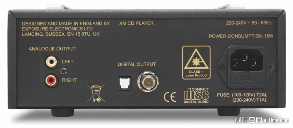 XM CD播放机所属的XM系列,外观方面依旧采用了简洁设计的拉丝面板,但是身形却比以往的产品缩小了一半,因此XM系列可定义为桌面系统。Exposure XM CD机采用顶置推盖式的碟仓设计,因此前面板非常简洁。机器的后部则设有一组RCA输出,以及BNC和光纤数码输出。XM CD机并没有加入时下流行的USB输入端子,而是专注于CD的播放。