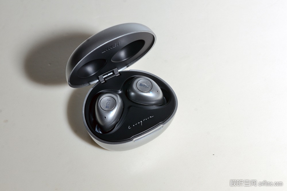 打开Mu3的电池盒,我们可以看到“Lovegrove”的签名,这是设计师的名字。Lovegrove是何许人也?他便是英国设计大师Ross Lovegrove。KEF在2007年推出的Muon扬声器便是Lovegrove的设计。抛光铝材箱体、曲线玲珑有致的Muon是美学与声学的完美结合,是KEF的代表作,也证明了Ross Lovegrove作为一名享负盛名的工业设计大师,在扬声器方面的设计也同样了得。在2015年他再次与KEF合作,设计了Muo蓝牙音箱,设计灵感来自Muon,同样有着迷人的线条和优秀的质感,也获得了无数音响媒体的奖项和设计大奖。Mu3是Lovegrove合作系列的最新成员,表面也采用曲线处理,光亮银灰色表面,虽然和多数真无线耳机一样都是“豆型”腔体,但表面凹陷处理和特别的漆面使它看上去特别“闪耀”,或许这就是它虽然小巧但特别吸睛的原因。