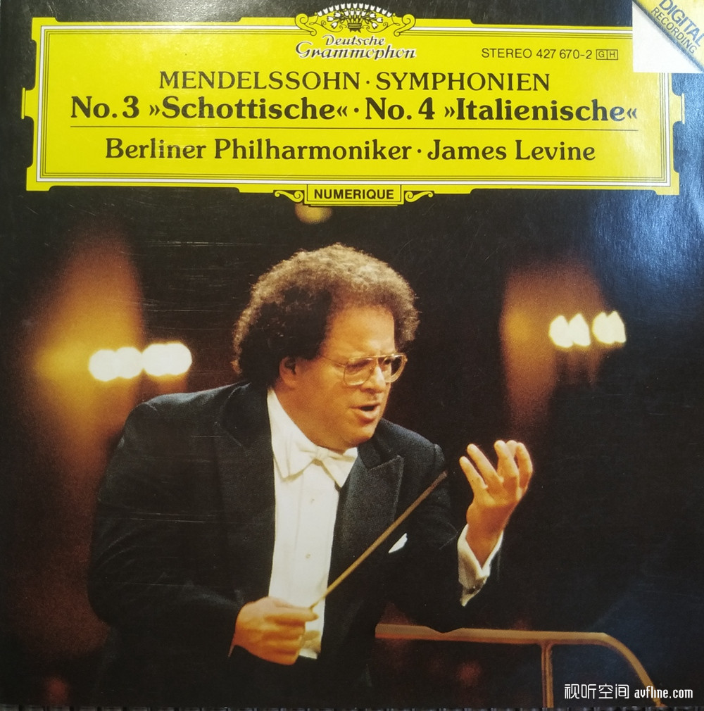 DG公司1989年出版的《门德尔松第三、第四交响曲》(编号:DG427 670-2)是颇能代表詹姆斯·莱文在管弦乐作品方面诠释能力的录音。门德尔松的第三交响曲“苏格兰”是古典交响曲的代表,内容以苏格兰的风土人情为发想创作而成。第四交响曲“意大利”描绘的是作曲家前往意大利旅行,在游览罗马、威尼斯、那不勒斯等名城和乡村后根据游览经历创作的交响曲,也是门德尔松的名作。这两部交响曲演出灌录唱片的指挥家和乐团不胜枚举,詹姆斯·莱文棒下的柏林爱乐乐团是首屈一指的德奥系名团,本身整体的合奏素养就有非常高的层级,演奏起同为德奥体系的门氏作品简直不做第二想。这一版的“门三”、“门四”在严谨的风格中深刻地掌握了音乐的精神本质,说服力十足。在“门三”中,詹姆斯·莱文以相当的审慎态度来处理各个乐章之间的脉动,柏林爱乐乐团鲜活的管弦乐色彩充满着朝气,比如第四乐章起始“最活泼的快板”,第一主题呈现得狂热而激烈,充满了苏格兰风味,第二主题同样充满活力;终结部后半部转为很庄严的快板,苏格兰民歌风格的旋律,在明亮的音响效果中无比绚丽灿烂,令人印象深刻。“门四”首乐章脍炙人口的主题就先声夺人抓住听者的耳朵,莱文与柏林爱乐的组合以轻快自然的韵律感切入作品,旋律走向重视歌唱性,使得音乐的叙述流畅优美。指挥与乐团始终保持着绝佳的默契,将浪漫情怀不疾不徐,一点一滴注入这首乐曲当中,其老练平顺的指挥手法,掌握了乐曲的特色并赋予其年轻的生命力。