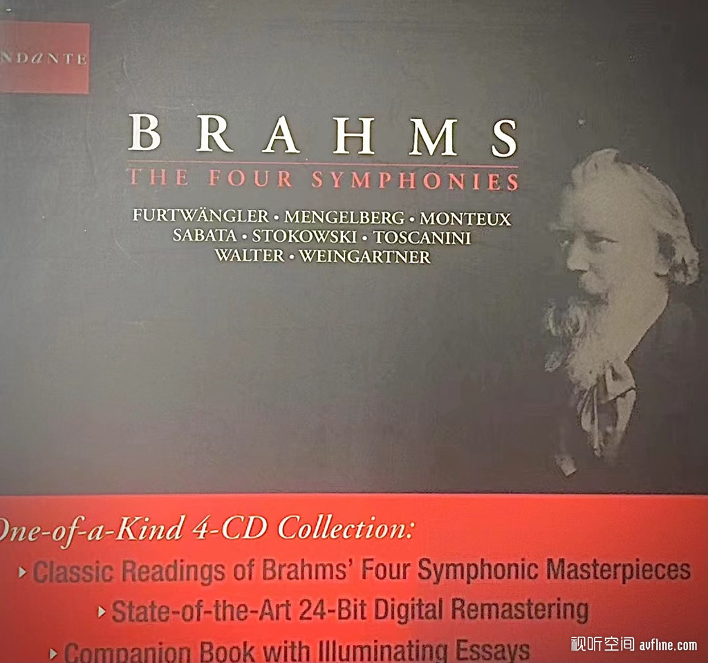 Andante唱片公司把布拉姆斯4首交响曲各重复一次,一共8首,每首都是不同指挥家。布拉姆斯3号分别由华尔特(Walter) 和门格贝尔格( Mengelberg )指挥,1932年和1936年的录音,不能期望音色有多好,不过门格贝尔格的录音能听出他对乐团的掌控是一流的,1932年的录音有不少杂音,不过声音的整体上是通透的,一点都不闷,CD翻录得不错,整首交响曲不断地在倾诉。而听这种老录音最过瘾的就是能够听到弦乐的弓法和力度掌控。