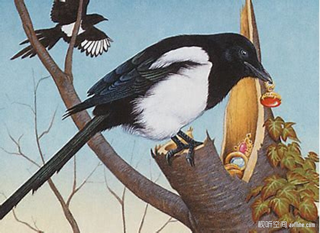 歌剧《贼鹊》的故事是典型的喜剧:人们翻箱倒柜没有结果,后来在小鸟的巢穴里找到了主人丢失的珍珠项链,因此而被误判的女仆及其老父得以清白(看样子,地球那边的“冤假错案”也挺严重的呢)!