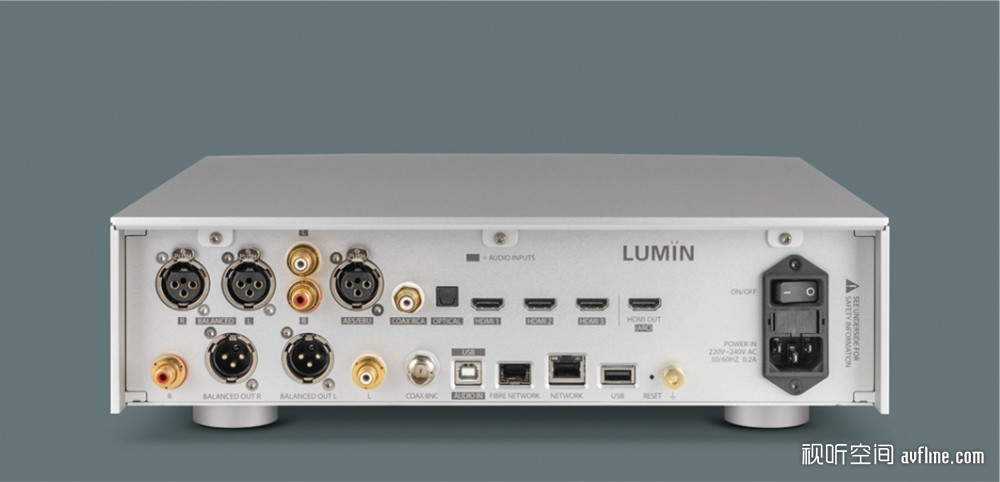 Lumin最新推出的重量级新品P1,外观延续了Lumin经典的弧形面板设计,前面板上也是一如既往地只设有一个屏幕用于显示状态,但体型比其他的串流播放机都要大,功能更是丰富多元,Lumin P1不仅是串流播放器,也是一台DAC,还是一台前级,从它的接口就可以看出它的功能丰富程度。P1设有XLR以及RCA模拟输入各一组,数码方面提供了同轴、光纤、AES/EBU各一组,以及一组用于连接电脑的USB-B接口、一组连接U盘/移动硬盘的USB-A接口、一组RJ-45网线接口和光纤网络专用接口。输出方面除了XLR和RCA模拟输出各一组外,设有BNC以及USB输出。值得一提的是,P1提供了3组HDMI接口以及一组支持ARC音频回传的HDMI接口(HDMI 2.0,支持4K直通),方便用家连接蓝光机、游戏机、机顶盒以及电视,用立体声的系统也能感受到震撼的电视/电影效果。