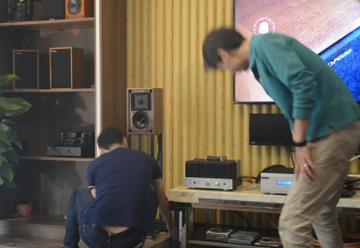 试听现场有6对参赛音箱,工作人员在更换音箱中