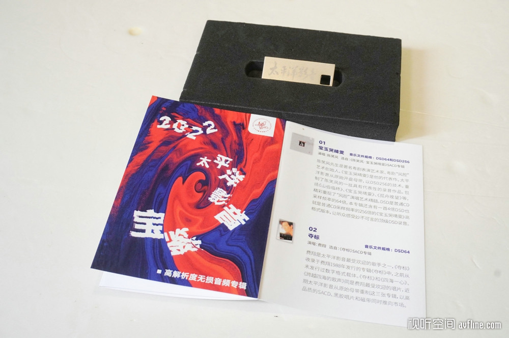《2022太平洋影音宝鉴·高解析度无损音频专辑》是本年度太平洋影音的特制产品,从未出现过在太平洋影音的产品之中。“高解析度无损专辑”收入的全部是高解析度无损的、母带级别的录音文件,包括5段24bit/96kHz、1段24bit/48kHz的WAV文件、6段DSD64格式的dff文件、1段DSD256的dff文件,全部使用U盘承载发行,规格将大大高于传统CD的16bit/44.1kHz,DSD256格式是仅存在于录音母带、极少出现在市售产品中的超高规格录音。《高解析度无损音频专辑》使用的这段DSD256录音是粤剧艺术大师陈笑风的巅峰时期代表作《山伯临终》,是国内主流唱片公司首次公开超高级别母带音源。