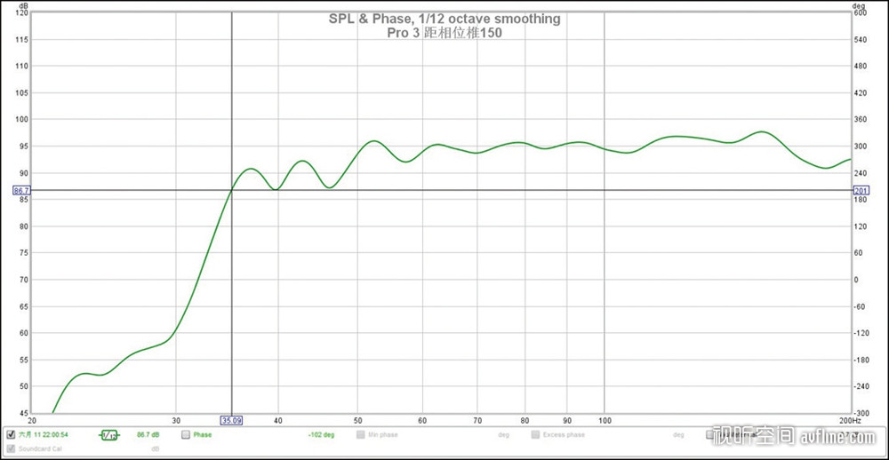 从这1/12的轻度平滑频响曲线可见,Pro3在200Hz内的低频总体较为平直,而且从35Hz往下,才开始逐渐衰减。看来厂方标45Hz是保守的,这35Hz的实测数据,可说是接近很多无源小落地箱了。