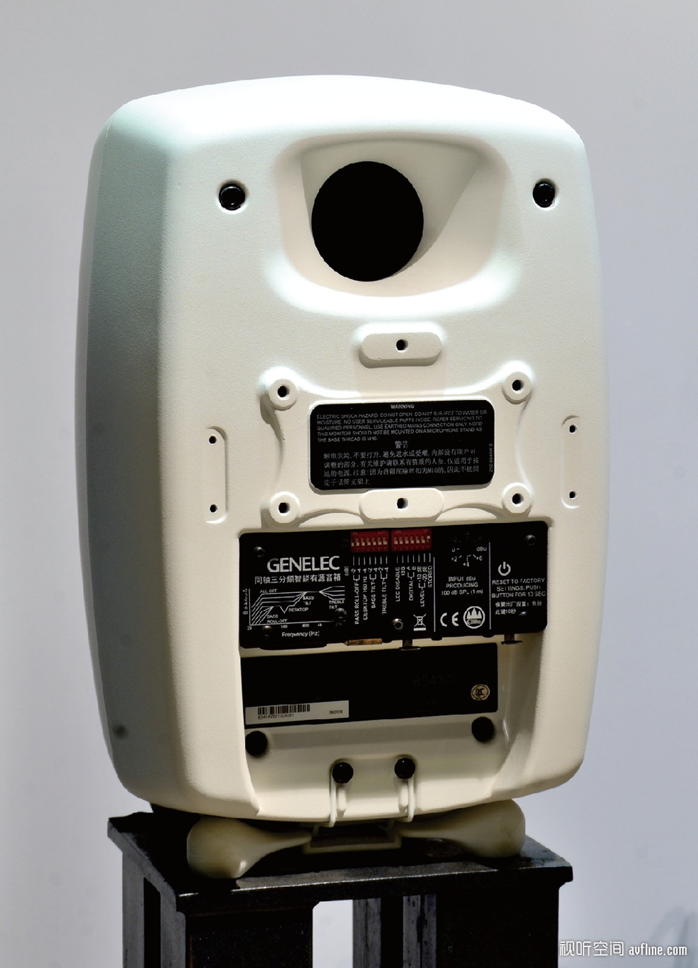The Ones系列产品支持模拟、数字两种输入方式,内置高精度DSP与解码。本次笔者试听的8341A,配置了170 x 90 mm赛道式双低音单元与3.5英寸中音加0.75 英寸高音同轴单元。仔细观察8341A的背部,其模拟输入端口只配置了XLR,数字输入也只支持AES/EBU,整个The Ones系列都是如此,这点大家在购买时需要注意。
