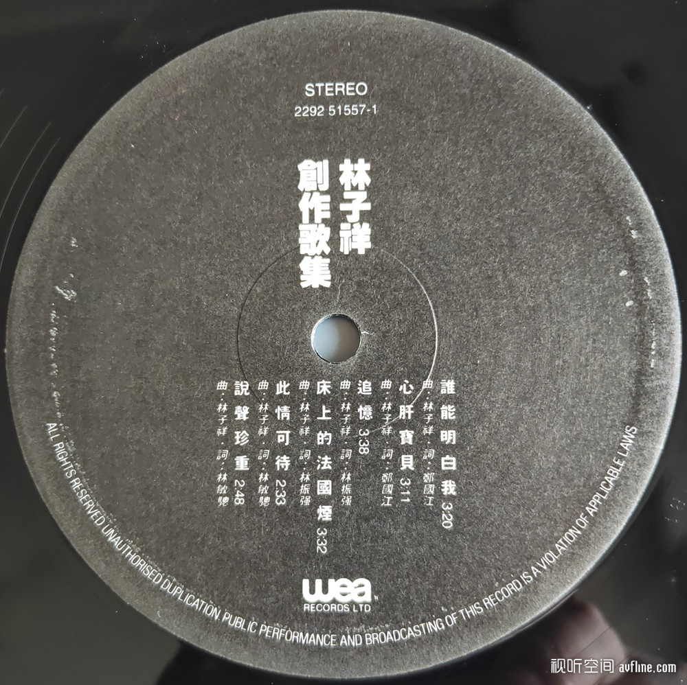 至于版本及其声音,(一)在笔者收藏的多张《林子祥创作歌集》黑胶中,主要有凸心靓声版、普通平心版、圈心凸边版三个版本。(二)音响发烧友对这张黑胶唱片最一致的评价,就是声音密度高、幼细、顺滑。笔者最初购买的一张普通平心版,也是最普遍、最常见的版本,即使用MM唱头播放,虽然声音稍粗点,但也基本是这个声音特点。然而,随着听的香港流行黑胶唱片越来越多,对比也越来越多,后来发现要播得这张黑胶唱片达到厚润的靓声程度并非易事,笔者自然也是有意在各大发烧友的音响系统去试,竟也是如此。(三)而圈心凸边版几乎与其他所有不同品牌的凸边版一样,声音都是偏虚、浮、蒙,背景稍噪,密度次之。(四)自从发现了香港华纳黑胶唱片的凸心问题及其规律后(见《香港流行黑胶唱片的价值与版本鉴别(33)陈百强《一生何求》兼谈华纳黑胶的凸心问题》),经过不懈的搜寻关注,终于在广州毅德音响处见到这张凸心靓声版的实物。据介绍,这张黑胶唱片的凸心版,还分“半凸”与“全凸”圈心,全凸圈心版要比半凸圈心版声音稍厚,笔者购得这张是全凸圈心版。公平起见,笔者在另一位朋友的音响系统进行对比,同时请来一众发烧友进行“盲听”,结果一致认为凸心靓声版要比普通平心版厚润。(五)笔者很早便从个别资深黑胶经销商那听闻,香港流行黑胶唱片的录音普遍存在“正相”与“反相”的问题,要用相同的“声音相位”才能播放得好。据说《林子祥创作歌集》是“反相”录音,刚好朋友家的前级功放有正反相调节功能,听完“正相”,立即将按钮调到“反相”,试听结果一致认为,《林子祥创作歌集》黑胶“反相”的声音要比“正相”更为清晰,乐器更有层次感。可惜,香港华纳公司的凸心靓声版黑胶唱片市场存量极少,而《林子祥创作歌集》的凸心靓声版甚至可以用罕见来形容。毫不夸张地说,此类极其罕见版本的香港流行黑胶唱片,从其历史渊源来看,已俨然成了“文物”。