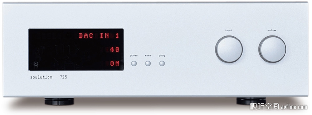 725以分立元件打造出对称的左右独立双单声道,所有的输入端都设计了连续监测DC直流的保护线路,并配置了能自动开闭的发烧级电容以阻隔直流的进入,保证系统最大的安全性。音量采用数字控制,每声道由80颗高精密Vishay电阻与继电器构成切换阵列,总共80级同时兼顾控制音量和平衡度。而音量控制线路并非单纯的电平衰减,而是通过PGA(可编程增益放大器),以避免电平峰值过载可能带来的失真,通过主动控制获得平滑的音量控制性能。